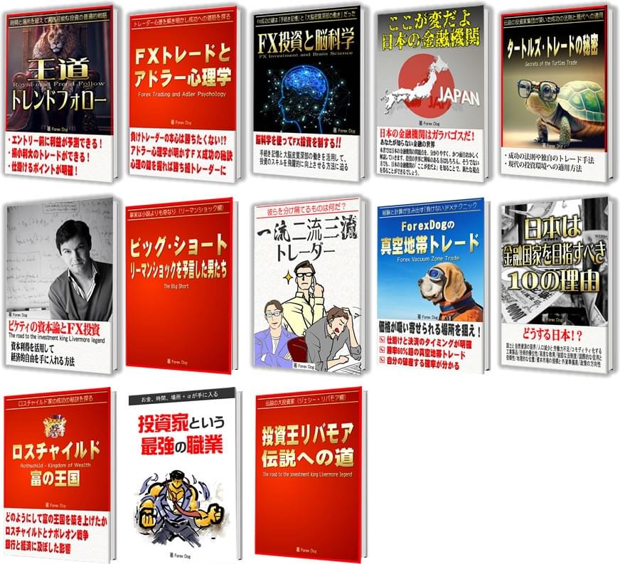 まず"投資家という最強の職業"で、投資家という職業の魅力と可能性を学びます。次に"王道トレンド・フォロー"や、"ForexDogの真空地帯トレード"など、基本的な投資戦略を理解します。